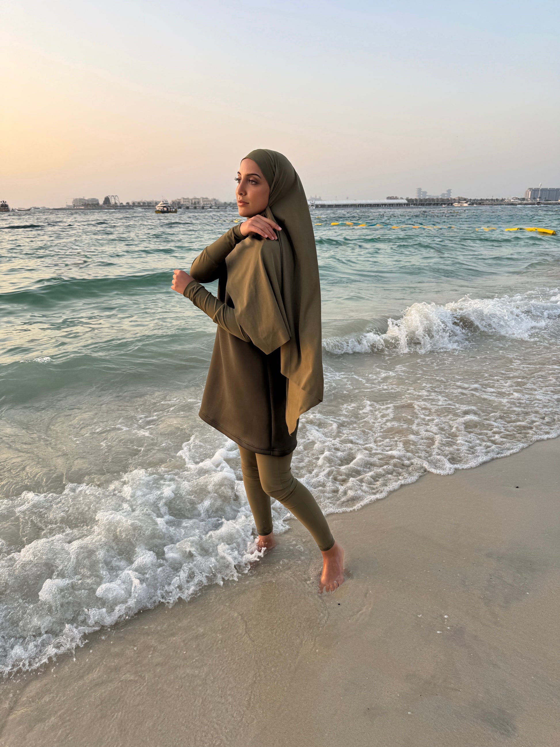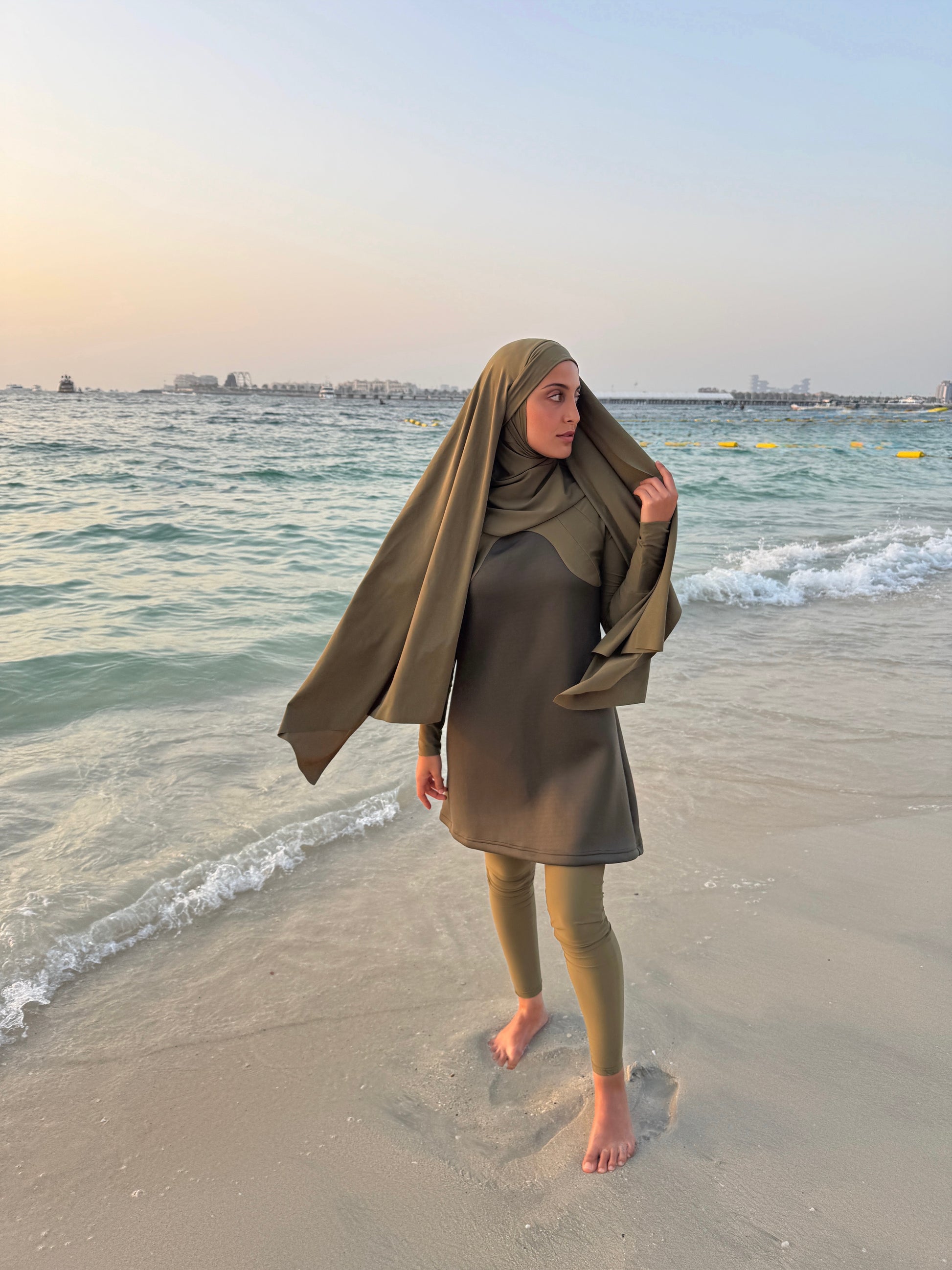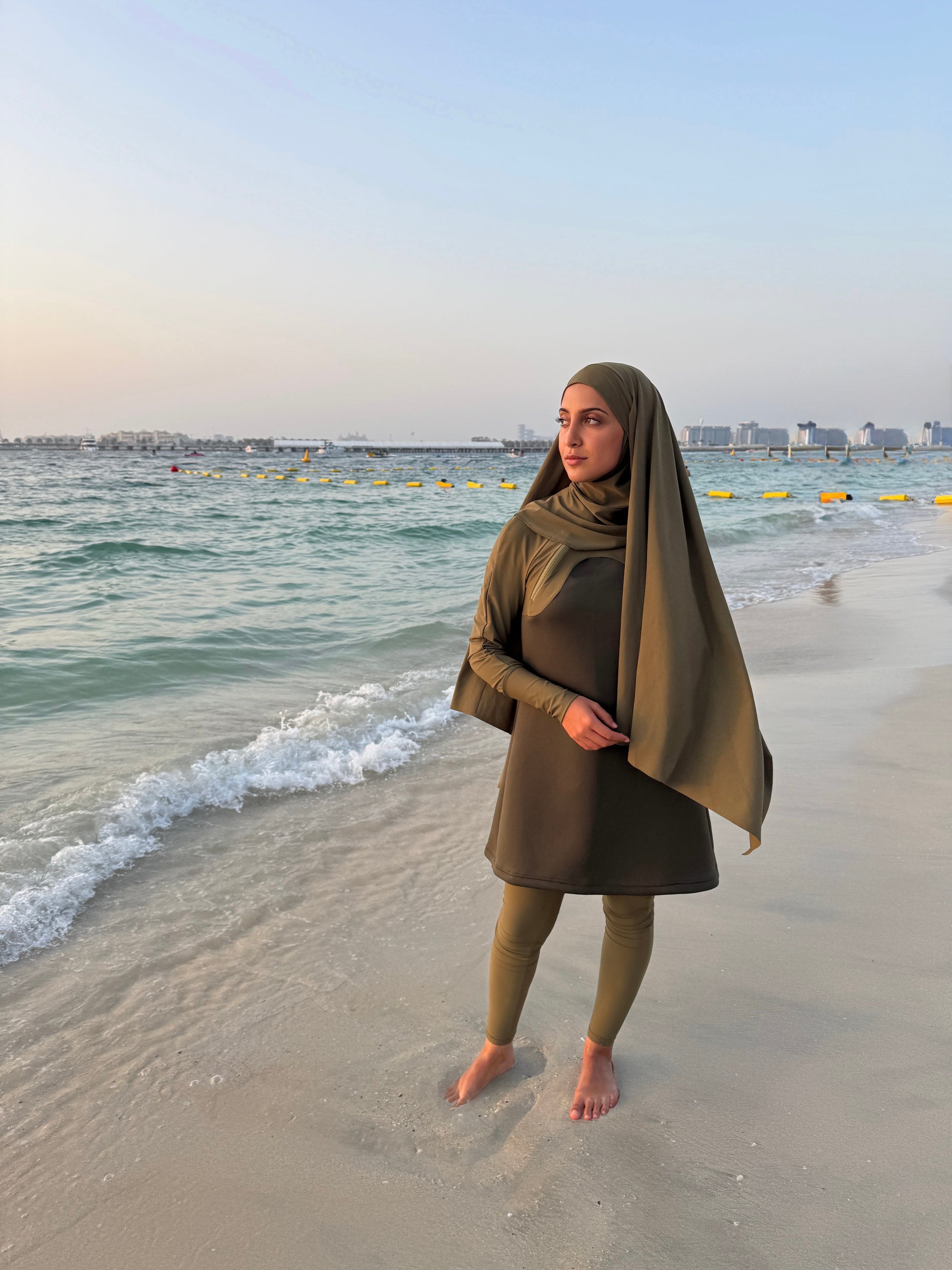 so wird dein Strandurlaub modern, bequem und selbstbewusst: Unser Mijam Set besteht aus Burkini, passendem Kopftuch mit eingenähtem Ninjabone und Leggings – perfekt aufeinander abgestimmt für einen trendigen Auftritt am Wasser. Der innovative Schnitt und das hochwertige, schnell trocknende Material sorgen dafür, dass nichts unangenehm klebt – selbst nach dem Schwimmen. Für alle, die Stil und Komfort lieben und keine kompromisse bei Modesty eingehen wollen!